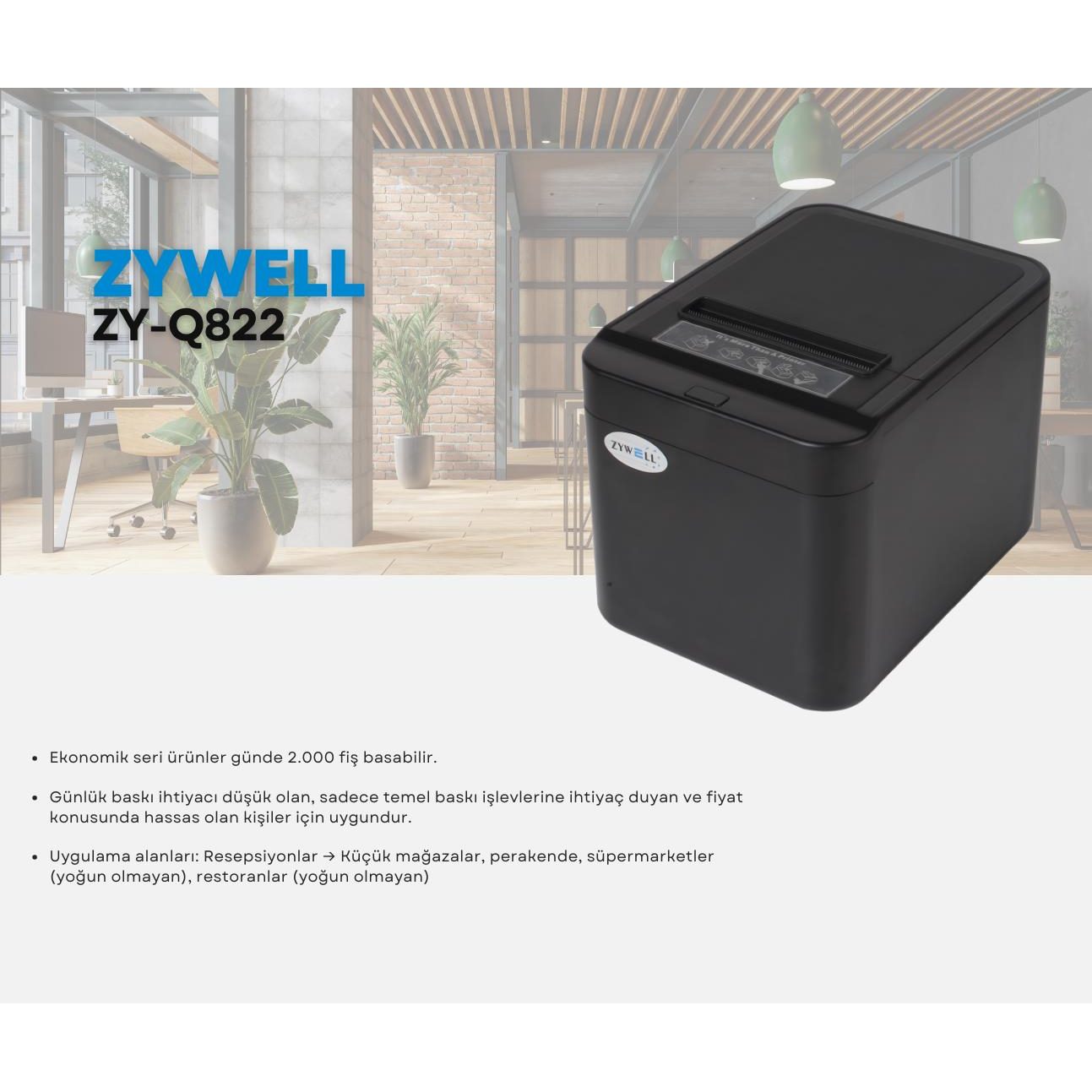 ZYWELL ZY-Q822 THERMAL / OTOMATİK KESİCİLİ USB+ETHERNET SLİP YAZICI 200MM/s / 80MM SİYAH